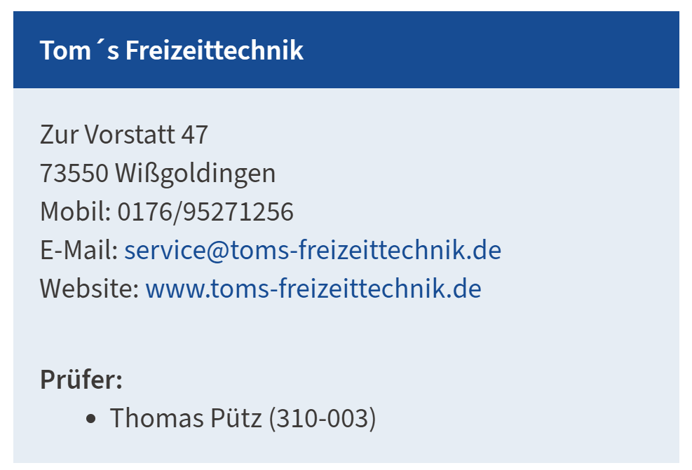 Ich bin als „Befähigte Person“ nach DGUV 110-010 (TRBS 1203) und deswegen auch bei der BGN als Prüfer gelistet: ->